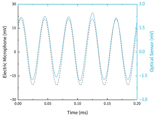 The signal from the optical fiber sensor was referenced to the electric signal from the microphone, as presented in Figure 6, where the temporal signal from the two microphones (electrical and optical) is demonstrated for a frequency of 25 kHz. The signal from the electric microphone also served to ensure that the input acoustic pressure was constant.
