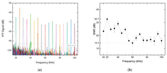 The Fast Fourier transform (FFT) of the output signal allows to determine the readout frequency as well as the signal to noise (SNR) of the optical sensor. The FFT for applied frequencies between 20 and 100 kHz is presented in Figure 7a. The SNR was calculated assuming a constant noise level for all frequencies. The SNR values varied between a minimum of 14.3 dB, for a frequency equal to 60 kHz, and a maximum of 32.7 dB, for a frequency of 25 kHz. The SNR values for the studied frequencies is presented in Figure 7b.