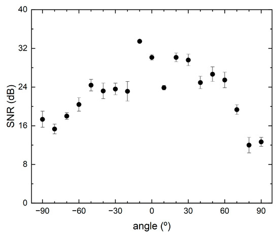 The directional response of the sensor was studied by varying the angle between the sensor and the piezoelectric actuator, maintaining frequency and amplitude constant. The directional response, presented in Figure 8, attained a maximum SNR value of 33.4 dB for an angle of around −10° between the sound source and the sensor. This may be due to small misalignment of the sensor regarding the sound source position. For angles of magnitudes between 20° and 90° the SNR decreases monotonically to a minimum of 12 dB at 80° angle.
