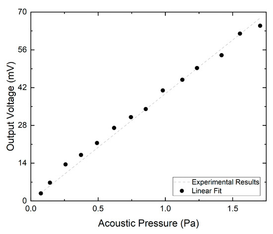 The dynamic range is, per definition, the difference between the minimum detectable pressure (MDP) level and maximum input acoustic pressure readable by the system without distortion or non-linearities. The output voltage of the sensor, for the different applied acoustic pressure is presented in Figure 9. For the studied acoustic pressure range, the output voltage of the sensor exhibited a linear response to acoustic pressure with an R-square of 0.998. Harmonic distortion was observable for acoustic pressures higher than 1.96 Pa (99.82 dB-SPL), indicating that this is the maximum acoustic input of the sensor. The noise-limited MPD was calculated by applying an acoustic wave with frequency of 25 kHz and acoustic pressure of 256 mPa (82.2 dB-SPL). The SNR in this conditions is 37.65 dB, with a resolution of 50 Hz, resulting in a noise-limited MPD of 478 µPa/ (27.57 dB-SPL). The dynamic range of this sensor is limited by the MDP (27.57 dB) and the maximum acoustic input (99.82 dB), yielding a dynamic range of 72.25 dB.