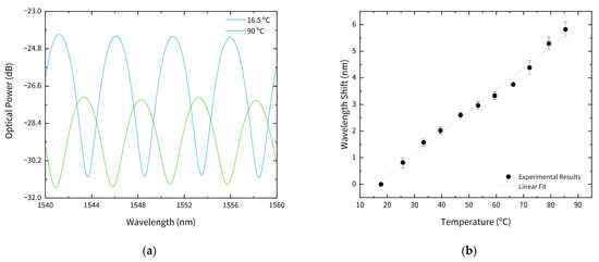 Temperature response of the sensor, for temperatures between 16 °C and 90 °C: (a) reflected spectrum for 16.5 °C and 90 °C; (b) wavelength shift with temperature.