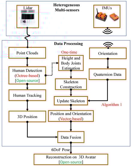 The proposed system provides a more feasible and robust system for human pose estimation with accurate detection, tracking, and reconstruction on a virtual avatar using multiple sensors (Lidar and IMUs) on an open-source platform. Figure 1 shows the proposed system workflow and Figure 2 shows an overview for pose tracking.