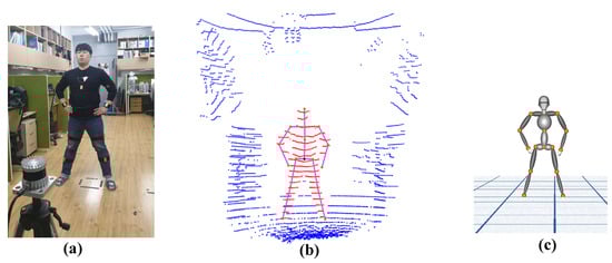 Proposed human tracking system overview: (a) Heterogeneous sensing experimental setup, (b) Detected user in lidar data and skeleton construction, (c) Reconstruction on 3D Avatar.