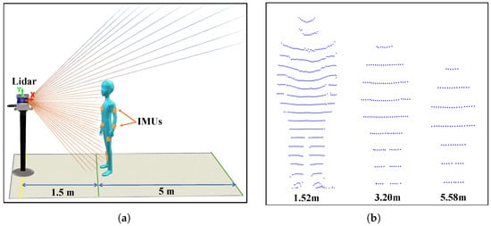 The maximum range for human body tracking is 14–17 m [], depending on the lidar sensor specification and working environment. Figure 3b shows human detection scenarios at different distances using a lidar sensor. We used a 32 channel lidar sensor with 55 m range and ±1.5–5 cm accuracy. Lidar accuracy varies with distance from the sensor, being somewhat better within 1–15 m (±1.5 cm). Therefore, the proposed setup ensured the lidar was well within the best operating range for the indoor environment ( m), with a human motion tracking area of 1.5–6.5 m distance (full tracking range in the x axis = 5 m), as shown in Figure 3a (green lines).