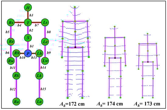 Figure 4 shows the skeleton structure with 15 segments ( to ) and 16 connecting joints parameters. It also shows the estimated height of a user (real height of the user is 172 cm) and skeleton construction for the data shown in Figure 3b. Detailed skeleton parameterization and construction is given in [].