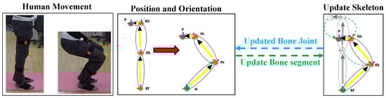 We considered each joint position to be a unit vector in the direction parallel to the respective bone axis in the attention pose. The orientation in the form of quaternion from the IMU sensor is multiplied to the unit vector to update the joint position. The vector-based bone joint position and orientation estimation is given in the Algorithm 1. Figure 5 shows the vector-based pose estimation from the IMU sensors and more detail is discussed in []. Parallelly, the position from the lidar data was estimated by detecting the user point cloud in real-time by using a similar step as discussed above in Section 3.2 for the continuous point cloud frames.