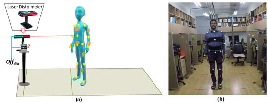 Figure 6 shows the experimental setup. We captured user pose ground truth data using a Leica Disto meter [] from markers placed on bone joints (Figure 6b) simultaneously with data from the proposed heterogeneous multi-sensor tracking system.