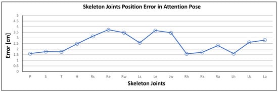Skeleton reconstruction accuracy using the estimated height was evaluated for single attention pose joint positions (Figure 6b). Head height was considered as the standard measurement proportion for skeleton joint construction. Figure 7 shows that individual joint position errors compared with ground truth were always <4 cm, with mean error in the attention pose <2.5 cm. Therefore, mean height and skeleton joint position error were insignificant and, therefore, had a minimal effect on human pose tracking.