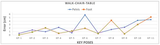 We evaluated the proposed human pose tracking method performance against ground truth data from the Disto meter as discussed in Section 4.1. Figure 8a shows that the user performed an activity requiring significant position movement in the pelvis and right leg for this evaluation: walking from the start position (KP-1), sitting on the chair (KP-6), and then moving to a small table (KP-11) and placing their right foot on the table. We checked the proposed method accuracy against ground truth for two joints: pelvis and right foot position for this scenario.