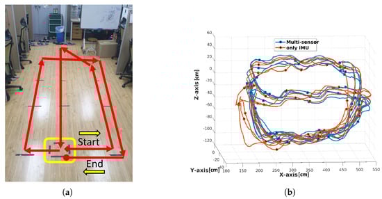 (a) Closed loop trajectory path, (b) inertial measurement units (IMU) only and multi-sensor system position data trajectory.