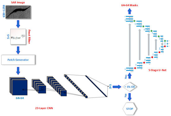 Then, the denoised images were split into patches of size 64 × 64 × 3. Further, patches are split into two groups; patches with greater than 1% oil pixels and patches with lower than 1% oil spill pixels. Patches with 1% oil spill have almost 40 pixels out of an overall 4096 pixels with a “1” label that can safely be considered background patches. Further, the patches with less than 1% oil spill increase the imbalance of the dataset and reduce the model’s accuracy if they are considered with other patches. Patches are then provided to a two-stage deep-learning framework, as shown in Figure 3. The first stage uses a novel CNN that consists of 23 convolutional, rectified linear units (ReLU), pooling, fully connected, and SoftMax layers and defined in Table 2. At the SoftMax layer, the cross-entropy (i.e., predicted probability distribution of each output generated by each node of the final two-node fully connected layer) is calculated, and defined as follows: