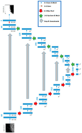 The U-Net consists of a five-stage contracting path, a five-stage expansive path, and a bottleneck bridge [30]. Each contracting stage comprises two 3 × 3 unpadded convolutional/ReLU layers (blue arrows) and a single 2 × 2 max pooling layer with a stride of 2 (red arrows). The number of channels in the five stages of the contracting path is 64, 128, 256, 512, and 1024. Every stage of the expansive path consists of a 2 × 2 upsampling, two 3 × 3 convolutional/ReLU layers (blue arrows), and concatenation with a cropped feature map of the corresponding expansive path (gray arrows). A final 1 × 1 convolutional layer is used to generate the corresponding masks of 64 × 64 × 1 pixels.