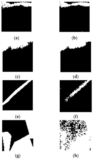 Figure 5 shows examples of predicted labels using the proposed deep learning framework under different class imbalance conditions and their corresponding ground truth masks. As shown in Figure 5, the proposed model was able to detect oil spills in patches with relatively balanced pixel labels. Simultaneously, it could not accurately segment patches with relatively higher background distribution as in Figure 5e or relatively higher oil spill distribution as shown in Figure 5g.
