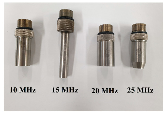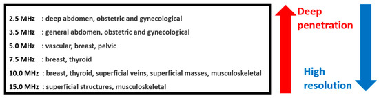 Figure 1 shows the penetration depth and imaging resolution for an ultrasound diagnostic analysis. Since the imaging resolution and penetration depth have a trade-off relationship, ultrasound transducers with smaller piezoelectric elements are used depending on the body parts [6]. For the heart and abdomen areas, 2–3 and 3–5 MHz transducer devices are preferable because of the penetration depth [5,7]. For the eyeballs and breast and thyroid areas, 7.5–12 MHz and 7.5–13 MHz transducer devices are used due to their relatively high imaging resolutions [5,7]. In particular, for peripheral blood vessels and digestive tract areas, small transducer devices with a high frequency, such as 15–30 MHz, are used because of the higher imaging resolution, which reduces the penetration depth [8,9,10].