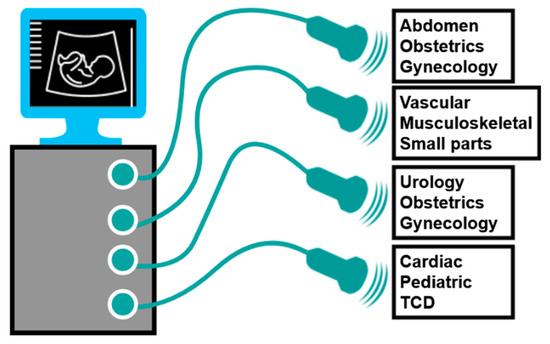 Figure 2 shows the ultrasound transducer probes (devices) used in ultrasound systems for specific applications [7,11]. Each ultrasound transducer probe has different frequency characteristics and shapes; thus, different anatomical cross-sectional images are obtained [11,12]. However, only one ultrasound system may not cover the transducer probes with different frequency ranges.