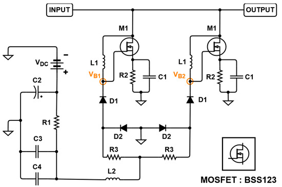 Figure 4 shows a schematic diagram of the designed BWE to show the circuit element values. Table 2 shows the numerical values of the resistors, capacitors, and inductor elements in Figure 4. R1 and R3 were used to be tuned to have proper voltage distribution and power consumption because M1 needs to be operated properly. The input signal was connected to the gate of M1 to form a feedback loop and can cause oscillation to be blocked through L1. However, the too high value of inductance may distort the input signal, so we properly selected the inductor value. R2 and C1 play a major role to lower the input impedance because the drain and source of M1 are shorted. If the impedance is too low, signal amplitude can be reduced. Thus, we properly selected those values for an input signal of 15 MHz. This circuit is added to the circuit, as shown in Figure 3, and thus the amplifier performance by applying different constant DC voltages is changed depending on the MOSFET (M1, BSS123) operation. When this circuit is assumed to be an ideal current source or ideal switch, the DC bias voltage VB1 in the BWE circuit operates the transistor, M1, as described below [36,37,38]: