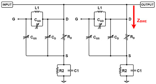 Changes in the performance of the amplifier only and the amplifier with BWE can be expected and compared based on pole calculations. Therefore, the equivalent circuit models of the LDMOSFET in the amplifier and the MOSFET in the BWE were simplified to calculate the poles. First, the input impedance (ZIN,basic) of the amplifier (Figure 5) was calculated as follows: