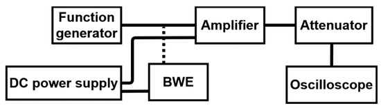 Figure 8 shows a block diagram showing the performance measurement of the amplifier only and the amplifier with BWE circuits. A function generator, DC power supply, attenuator, and oscilloscope were used to measure the performance of the designed circuits. A BWE circuit was installed between the function generator and amplifier. The BWE circuit operates when DC power is supplied by the power supply. The amplified signal can cause damage to the oscilloscope from a high voltage of 5 VP-P or greater. Therefore, the output signals were attenuated by a 40 dB attenuator, and the performances were measured using an oscilloscope [41,42,43]. To measure the performance of the amplifiers, the frequency and input signal amplitudes were adjusted using a function generator. In addition, the voltage gain was obtained from the measured output signals. As a result, the outputs of the amplifier and BWE circuit-equipped amplifier were measured and compared. The voltage gain is a performance indicator for measuring the performance of an amplifier, and its high output helps to provide a clear ultrasound image [44,45,46]. In addition, the bandwidth of the gain over frequency of the amplifier only and the amplifier equipped with the BWE circuit can be compared. The output signal is an important performance indicator of an ultrasonic transmitter because it shows the sensitivity of the system.
