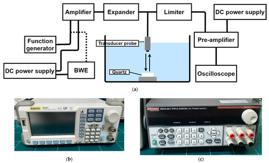 Figure 9a shows the measurement procedures used to obtain the echo signal of the transducer with the designed amplifier with and without a BWE circuit. Various instruments have been used to measure the echo signal to determine its compatibility with ultrasonic transducer probes [47]. The amplified signal was passed through the expander [48,49]. The signal was transmitted through the transducer probe and reflected by the quartz to be received [50,51,52]. The expander was used to remove the noise and reduce the ringdown signal from amplified signals [53,54,55]. Since the received signal has an extremely low amplitude, it is amplified by an approximately 32 dB gain pre-amplifier and then displayed on the oscilloscope. During this process, because quartz reflects more than 99% of the signal, the data of the echo signal can be measured to estimate the amplifier performance [56,57]. The amplified signal, called a discharged signal, is required to vibrate the piezoelectric element of the transducer probe; however, it is not necessary to measure the echo signal, and the oscilloscope can be damaged with a voltage of higher than 5 VP-P, and thus, it is minimized using a limiter [58,59,60]. Figure 9a,b shows the tested equipment components used in Figure 9a.