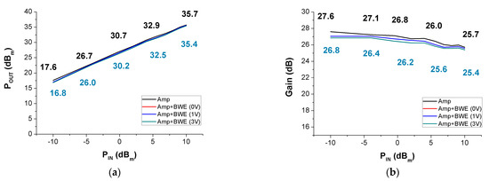Figure 12a,b shows the POUT and gain variances as the input signal increases. The black line shows the performance of the power amplifier. The red, blue, and khaki lines show the performance of the amplifier with the BWE circuit using 0V, 1V, and 3V DC, respectively. In the case of amp + BWE (0 V) and amp + BWE (1 V), the active device of the BWE (see M1 in Figure 4) is not in operation, and thus, they have almost the same performance. Therefore, the red line is almost identical to the blue line. In Figure 12a,b, the performance of the power amplifier has a higher POUT and gain than the amplifier with a BWE (3 V) of between −10 dBm and 10 dBm.