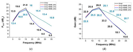 Figure 12c,d shows the POUT and gain according to frequency variations at an input power of −6.5. In Figure 12c,d, the performances of the amplifier at 5–16 MHz have a higher POUT and gain than the power amplifier with BWE (3 V). The performance of the power amplifier with a BWE (3 V) has a higher POUT and gain of 17–35 MHz, compared to the power amplifier only. The POUT of the power amplifier with BWE (3V) outperformed that of the power amplifier after 16.132 MHz. In addition, the −3 dB POUT bandwidth of the power amplifier only and the power amplifier with BWE (3 V) were 51.5% and 81.5%, respectively. The −3 dB gain bandwidth of the power amplifier only and the power amplifier with BWE (3 V) are 84.1% and 141%, respectively. By incorporating the BWE circuit into the power amplifier, the POUT decreases to 0.8 dBm, and the gain decreases by 0.8 dB when the PIN is −10 dBm. Theoretically, the magnitude of the transfer function increases with the addition of the BWE circuit to the power amplifier. Although the POUT and gain should be increased together, in practice, the final output signal can be slightly reduced because of the power loss of the passive components in the BWE circuit. However, in the graphs of the POUT and gain versus frequency, the POUT bandwidth increases by approximately 30%, and the gain bandwidth increases by approximately 56.9%. In this paper, the BWE circuit is used to widen the bandwidth by lowering the input impedance of the power amplifier. However, it does not decrease input impedance linearly at all frequencies. As shown in the experimental results, the bandwidth at the high-frequency range is wider than that of the low-frequency range because the BWE circuit has more impedance reduction at high frequency (See Figure 12c,d)
