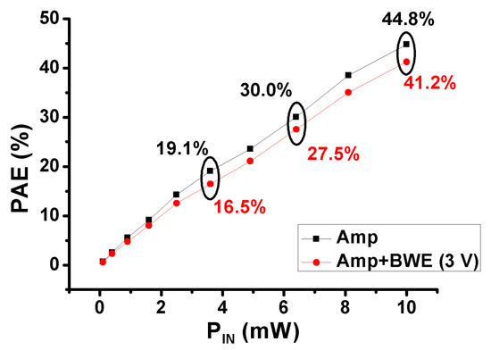 Figure 13 is the graph of the power added efficiency (PAE) of the amp and the amp + BWE (3 V) at 15 MHz. The PAE indicates how much DC power was used to amplify the input signal [15,75]. In Figure 13, the PAE versus PIN of the amp (44.8%) is higher than the amp + BWE (3 V) (41.2%) when 10 dBm input power is applied. This is because the additional DC power is used for the designed BWE, and the amp has a higher POUT versus the PIN than the amp + BWE (3 V). As a result, the PAEs of the amp and the amp + BWE (3V) do not show a big difference between them.