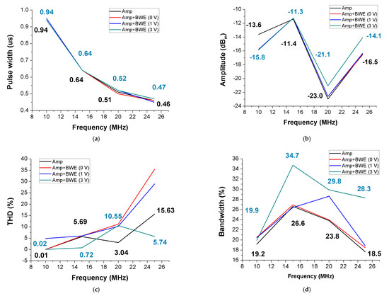 Figure 14a,b shows the measured results of the pulse widths and amplitudes over the time scale. Figure 14a shows the pulse width according to the frequency. The experimental results showed no significant difference in any of the measured frequency bands. Experimentally, the BWE circuit does not have a significant influence on the pulse width of the echo signals. Figure 14b shows the measured echo amplitudes of the peak-to-peak voltage according to the frequency using a 32 dB preamplifier. As shown in the graph, the amplitude of amp + BWE (3 V) was higher than that of the amp after 15 MHz. At 25 MHz, there is a difference of approximately 2.4 dBm. Since the echo signal has an extremely low amplitude, a 2.4 dBm increment in the amplitude is an attractive result.