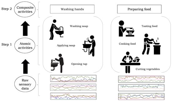 Human activity recognition (HAR) aims at verifying the individual’s activity of daily livings (ADLs) from the data captured using various multimodal modalities, e.g., time-series data from motion sensors, color and/or depth information from video cameras. Lately, HAR-based systems have gained the attention of the research community due to their use in several applications, such as healthcare monitoring applications, surveillance systems, gaming applications, and anti-terrorist and anti-crime securities. The availability of low cost yet highly accurate motion sensors in mobile gadgets and wearable sensors, e.g., smartwatches, has also played a vital role in the dramatic development of these applications. The main objective of such a system is to automatically detect and recognize the human daily life activities from the captured data by creating a predictive model that allows the classification of an individual’s behavior []. ADL refers to such tasks or activities that undertake by people in their daily life []. An ADL is usually a long term activity that consists of a sequence of small actions as depicted in Figure 1. We can describe the long term activities as composite activities, e.g., cooking, playing, etc., whereas the small sequence of actions are known as atomic activities, such as raising an arm or a leg [].