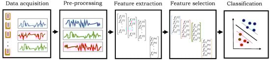 HAR systems usually follow a standard set of actions in a sequence which includes data capturing, pre-processing, feature extraction, the selection of most discriminant features, and their classification into the respective classes (i.e., activities) [] as depicted in Figure 2. The first step is the data collection using the setup of wearable sensors, force plates, cameras, etc. The selection of such a sensor is very much dependent on the nature of ADL to be recognized. In many cases, it is inappropriate to use raw sensor data directly for activity recognition because it may contain noise or irrelevant components. Therefore, data pre-processing techniques, such as normalization, recovery of missing data, unit conversion, etc., are applied in the second step to make the raw data suitable for further analysis. Third, the high-level features are extracted on this pre-processed data based on the expert’s knowledge in the considered application domain. Usually, several features are extracted and the most important of them are selected such that they retain the maximum possible discriminatory information. This process is known as feature selection which not only reduces the dimensions but also reduces the need for storage and computational cost. Finally, the features are recognized into respective activities using the classifier which provides the separation between the features of different activities in the feature space. It is worth mentioning that the performance of the HAR system is very much dependent on every step of the sequence.