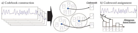 The depiction of codebook-based feature extraction process: (a) Codebook construction by grouping the similar subsequences using k-means clustering algorithm. The center of each group is set as “codeword”. (b) Features are computed on each of the subsequences by assigning them to the most similar codeword [].