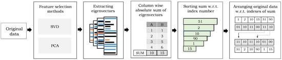 Since the real world, data may contain redundant, noisy, and irrelevant features which make the learning process complex; the removal of such features will not only reduce the complexity in the model learning but also reduce the need for storage and computational cost []. Another simple yet powerful use of the SVD and PCA is that they can also be used in the selection of optimal features by discarding the irrelevant information []. Therefore, we also employed them in the feature selection process to select the most influential features of original data that are having a greater impact on the recognition of composite activity. The entire process is explained in the following and depicted in Figure 4.
