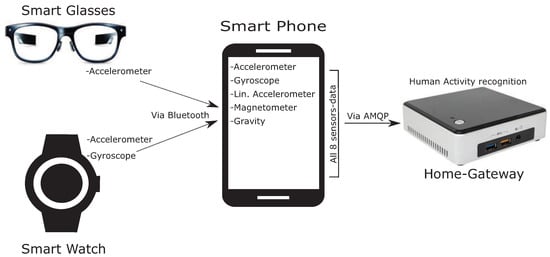 We used the CogAge dataset [], which contains both atomic and composite activities. The data is recorded using three unobtrusive wearable devices: LG G5 smartphone [], Huawei smart watch [] and JINS MEME glasses []. The smartphone was placed in the subject’s front left pocket of the jeans and it consists of 5 different sensory modalities: linear accelerometer (all sampled at 200 Hz), gyroscope, magnetometer (100 Hz), gravity, and 3-axis accelerometer. These sensory modalities are used to record body movement. Specifically, the linear accelerometer provides a three-dimensional sequence that specifies acceleration forces (excluding gravity) on the three axes. The gyroscope encodes three-dimensional angular velocities. The magnetometer sensor provides a three-dimensional sequence to describe the intensities of the earth’s magnetic field along the three axes which is quite useful to determine the smartphone’s orientation. The gravity sensing modality also generates a three-dimensional sequence that encodes the gravity forces on the three axes of the smartphone. The 3-axes accelerometer generates a three-dimensional sequence that specifies acceleration forces (including gravity) acting on the smartphone. Second, the smartwatch was placed on a subject’s left arm and it consists of two different sensory modalities: gyroscope and 3-axis accelerometer (both sampled at 100 Hz). Each of these sensing modalities generates a three-dimensional sequence of acceleration and angular velocities on the watch’s x, y, and z axes. These modalities are used to encode hand movements. Finally, the smart glasses are worn by the subject and it generates 3-dimensional data of accelerometer (sampled at 20 Hz). The accelerometer sensor in the smart glass provides three-dimensional acceleration information on the glasses’ x, y, and z axes which are used to record the head movement. Thus, the whole setup of activity encoding used eight sensor modalities through these wearable devices. The movement data of smart glasses and the watch is initially sent to the smartphone via Bluetooth connection and later all the recorded data sent to a home-gateway using a Wi-Fi connection. The entire process of recording is depicted in Figure 5.