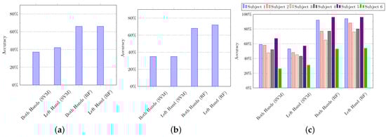 The composite activity recognition using handcrafted features with Support Vector Machine (SVM) and Random Forest (RF). (a) K-fold cross-validation, (b) hold-out cross-validation, and (c) leave-one-out cross-validation. In k-fold cross-validation, the training and testing data is split based on k folds. We set the value of k = 3. In hold-out cross-validation, the data of 3 subjects are used for training, and the data of the remaining 3 subjects is used for testing purposes, iteratively. In leave-one-out cross-validation, the data of 5 subjects are used for training, and the data of the remaining 1 subject is used for testing purposes, iteratively.