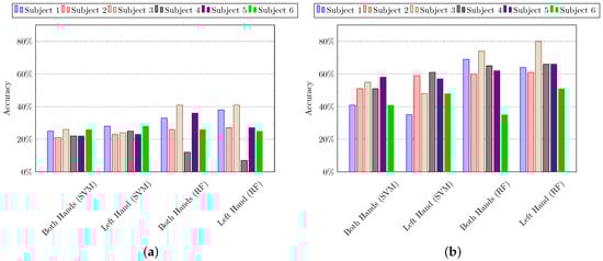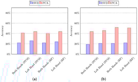 The composite activity recognition using features derived from the subspace pooling technique. The features are classified using Support Vector Machine (SVM) and Random Forest (RF). (a) Leave-one-out cross-validation: subspace pooling using singular value decomposition (SVD), and (b) leave-one-out cross-validation: subspace pooling using principal component analysis (PCA).