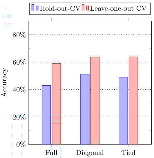 In the second set of experiments, the subspace pooling-based techniques are applied to the input data to project it into new dimensions to get the more robust representation of data in subspace []. In particular, we applied SVD and PCA on the input data, and their full-length features are used to recognize the composite activities using SVM and random forest algorithms. It is important to mention that all the features in new dimensions are used in the classification process. Figure 7 summarizes the results of experiments using k-fold cross-validation and hold-out cross-validation, whereas the results of leave-one-out cross-validation are summarized in Figure 8. It can be observed that the features extracted by using PCA performed quite well as compared to SVD.