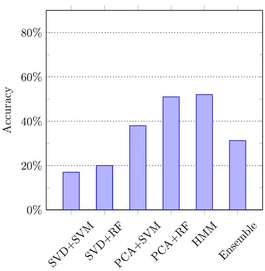 We computed 18 features on input data (i.e., atomic scores) as described in Section 4.2.1. These 18 features were computed against every column of features set of a single activity, i.e., 18 × total number of columns, and they are concatenated in a single row. Since the input data is 61-dimensional, the dimension of the handcrafted feature is (i.e., 1 × 1098). We used SVM and random forest (RF) to evaluate these computed features, and their recognition accuracies are summarized in Figure 6.