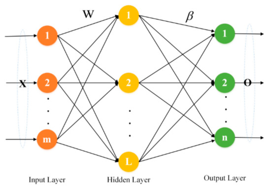 For the ELM, the connection weight between the input and the hidden layer, and the threshold of the hidden layer, can be generated at random, without subsequent adjustment. The weight between the hidden and the output layers is directly calculated by mathematical methods and does not need adjusting iteratively. Therefore, the ELM has obvious advantages over other networks in terms of generalization performance and speed. The network structure of the ELM is shown in Figure 1.