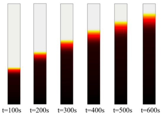 The dyeing industry is closely related to our daily lives, but the time required for dyeing is difficult to determine, leading to a certain amount of wasted time and resources. The proposed MCELM can predict the dyeing time well and bring greater reference value for related personnel. The multiphysics simulation software, COMSOL (COMSOL Inc., Stockholm, Sweden) can be used to numerically simulate the nonwoven fabric impregnation process, and the effect diagrams obtained at different times are as follows. Simulation requires complex model construction, parameter setting and complex calculation process. Figure 3 below shows the impregnation process of a nonwoven material with a porosity of 0.6 and a pore size of 4.75 × 10−7 m.