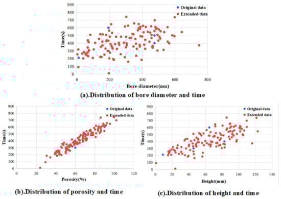 Comparison of the distribution of original data and extended data. (Among which, subfigures (a–c) represent the corresponding relationship between bore diameter, porosity, height and time, respectively).