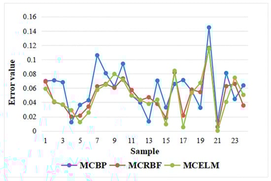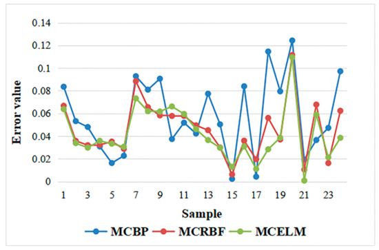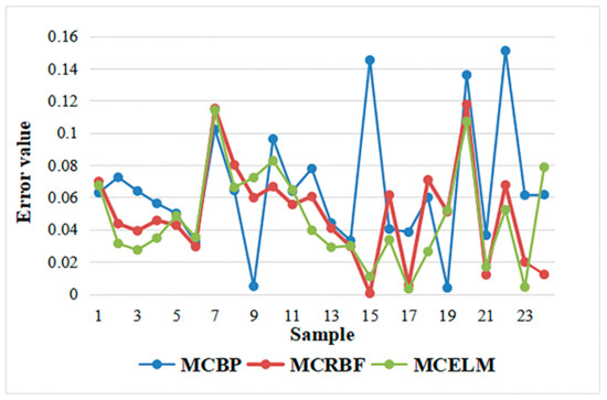 At this time, the prediction effect is poor with many errors exceeding 0.1. Adjust the number of hidden layer nodes of the neural network to 10. The errors of the MCBP, the MCRBF, and the MCELM are described in Figure 7.