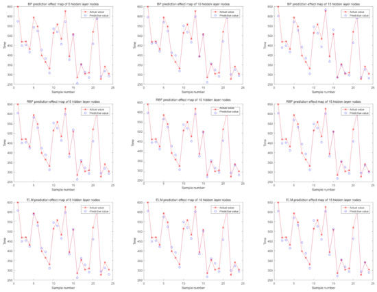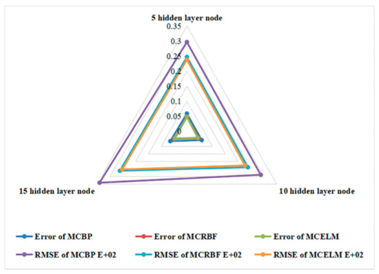 Figure 8 shows that the prediction errors of the MCBP, the MCRBF, and the MCELM models are also relatively low, in this case, but are higher than the error when the number of nodes is 10. In order to more clearly describe the errors when the number of hidden layer nodes are 15, 10, and 5, the overall comparison is described in Table 4.