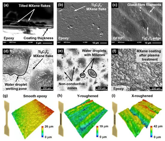 Scanning electron microscopy images of the sprayed MXenes: (a) thickness of the coating; (b) topography of MXenes on epoxy, and (c) glass fibre–reinforced polymer samples. Optical microscopy images of the MXene coatings: (d) sprayed for 2 s at 3 cm; (e) sprayed for 10 s at 15 cm; and (f) sprayed for 10 s at 15 cm on a plasma-treated epoxy sample. Optical topography images of epoxy samples that were (g) smooth, (h) roughened in the Y direction, and (i) roughened in the X direction.