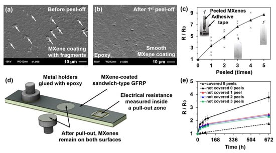 Scanning electron microscopyimages of the MXene coating (a) before peeling and (b) after the first peel-off attempt; (c) electrical resistance change during five peel-off attempts; (d) MXene coating pull-out test; and (e) electrical resistance change over a 4 week period.