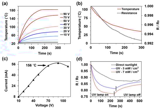 (a) Increase in the MXene coating temperature under different applied voltages; (b) change in the electrical resistance during the natural cooling process of the sample; (c) response of the electric current to applied voltage; and (d) relative electrical resistance response of the MXene coating to direct sunlight and UV irradiation.