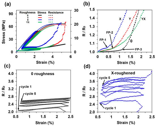 Results from tensile tests with five initial loading cycles on smooth and roughened MXene-coated epoxy samples: (a) mechanical response and relative electrical resistance measurements of four samples with different roughening; (b) magnified region showing the electrical resistance at low strains; and MXene resistance response under five loading cycles with 10–50 MPa amplitudes on (c) a smooth epoxy sample and (d) an X-roughened sample.
