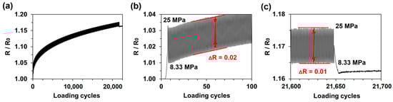 Fatigue test results of a smooth MXene-coated epoxy sample: (a) relative resistance during fatigue testing with an 8.33–25 MPa amplitude, and magnified regions showing (b) the first 100 cycles and (c) the last 50 cycles.