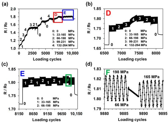 Fatigue test results for MXene-coated 0° glass fibre–reinforced polymer specimen: (a) relative electrical resistance response under 10000 loading cycles with varying amplitude; (b) magnified region showing the loading step series 0-1-2-3-4-3-2-1-0; (c) magnified region showing the loading step series 1-2-1; and (d) magnified region showing the loading step change from 2 to 1.