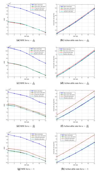 , and the achievable rate at the information receiver. For comparison purpose, the performances of three different allocation methods (equi-space, block-wise, and pseudorandom methods) are also evaluated. From the figure, block-wise subcarrier allocation method shows the worst MSE performance, while equispace and pseudorandom subcarrier allocation methods have similar MSE performances, which coincides with the discussion in