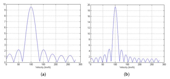. From the figure, it can be found that the peak position coincides with the radial velocity of the associated target, and the resolution can be improved as the number of pulses increases, which is also induced from (