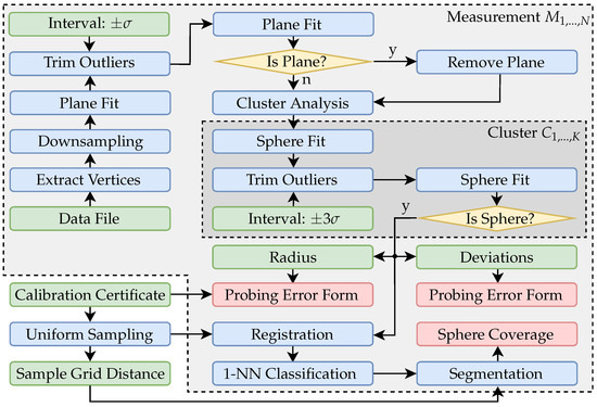 The positioning and the measuring procedure were automated, and the polygonal .STL format was chosen as data interface for the commercial systems. The files are exported with maximum quality. The measurements were carried out in air-conditioned laboratory rooms ( 20 °C) and required several days for each measuring system. The flowchart in Figure 6 shows all major data processing operations, which are necessary in order to calculate the corresponding characteristic parameters for each sphere position. First, the points are extracted from the measurement data. Since the commercial systems already use extensive internal preprocessing and smoothing algorithms, unfortunately, it is not possible to access the actual triangulated data. But, in the application context, it is possible to consider each of these systems as a black box. Therefore, the vertices are extracted from the premeshed .STL exchange files. The also applied endoscopic triangulation system from the TCRC 73 provides the pipeline with the actual triangulated point clouds. These were adaptively masked according to signal and calibration characteristics within the typical measurement routines [50]. Random downsampling to 50,000 data points is performed to speed up subsequent computations and to make any registration algorithms converge faster and more robust.